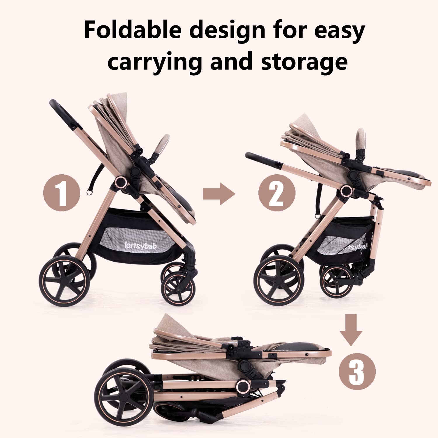 2-in-1 Baby Stroller with Bassinet Mode – Folding Infant Newborn Pram Stroller with Reversible Seat – Toddler Strollers for 0-36 Months Old Babies (Beige)