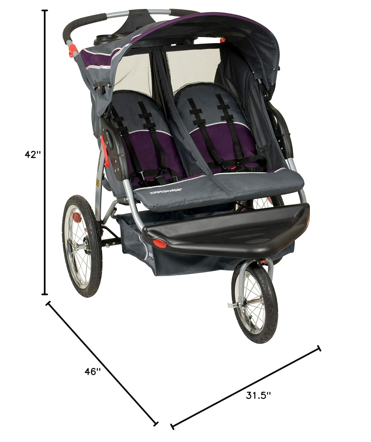 Take your family jogging with the Baby Trend® Expedition® Double Jogger. Made for two children, this jogging stroller features bicycle tires and a locking front swivel wheel that allows you to keep the front wheel in place while jogging. If you’re out for a leisurely stroll, simply unlock the front wheel for greater maneuverability. For your convenience, the parent tray includes two cup holders and covered compartment storage. For your children’s comfort and safety, the double jogger features a ratcheting shade canopy, a multi-position reclining seat and adjustable five-point safety harnesses. Store your children’s necessities in the large storage basket and you’re ready to roll. Know you’re traveling safely in this sturdy, lightweight double jogger that’s certified by the Juvenile Products Manufacturers Association. At the end of your trip, quickly and easily fold the stroller into a compact unit.