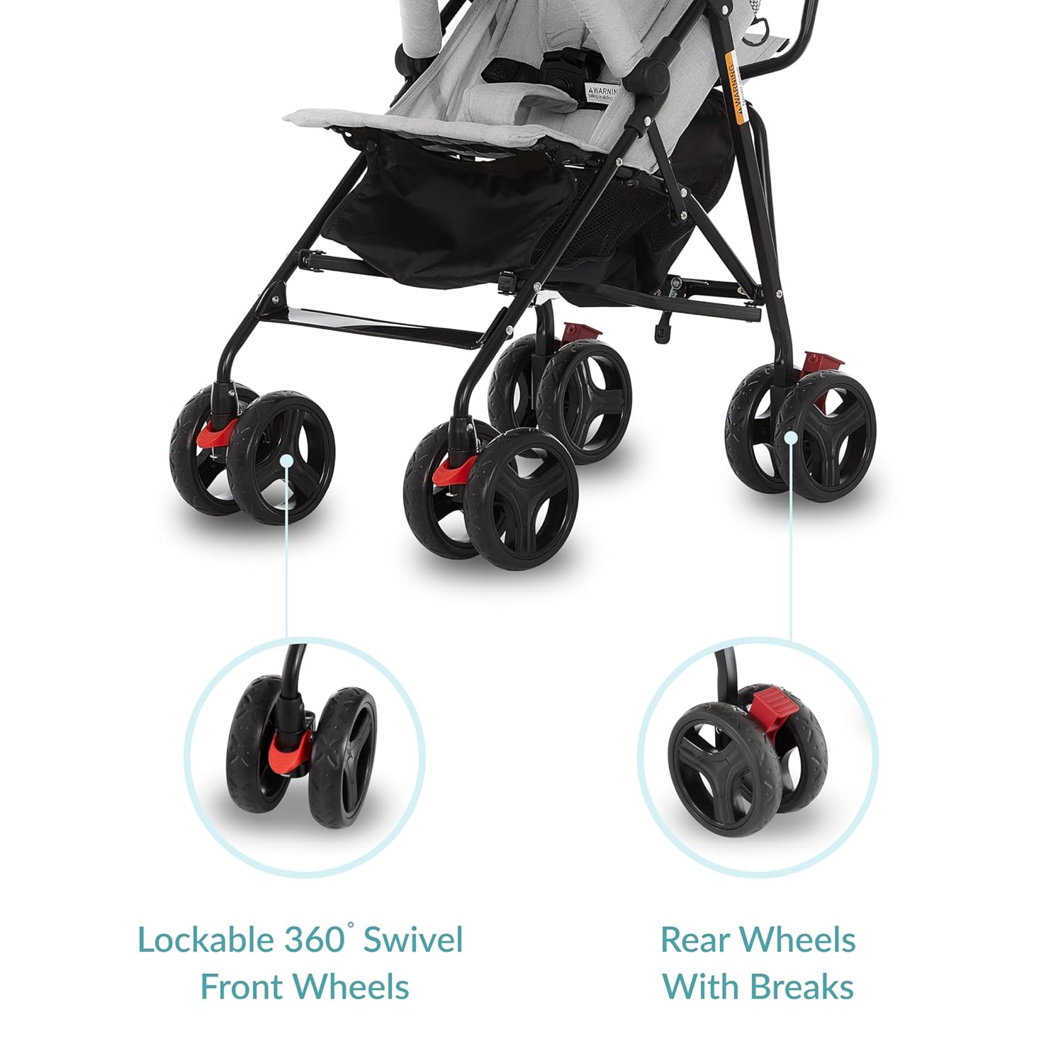 SAFE & SECURE: Comes with a padded 5-point harness system, rear wheel brakes and swivel front wheels for a smoother ride over bumps, which lock in, when straight. The angle and slope between the padded handle and rear wheels make space for easy walking