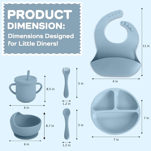 6 PCS Silicone Baby Feeding Set for Toddler First Eating – Led Weaning Supplies with Suction Divided Plate, Bowl, Cup, Bib, Spoon & Fork – Infant Self Feeding Dishes & Utensils (Light Blue)