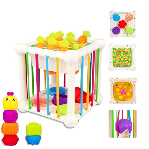 【Activity Cube Toys for Toddler】Combines 6 different activities in 1:Pull Carrot, Shape Matching Blocks, Stacking Blocks,Push shapes,Rotating Gears,Play Gopher.Montessori toys for 18+ Months kids, keeping your toddler engaged for hours and develop kid’s mind, senses and coordination.