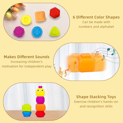 【Fun Developmental Toys】This educational toy is designed to promote counting & math skills, color, pattern, audio andshape cognition, and fine motor skills in an engaging, fun and interactive way.Babies can see and feel the diferences by touching them, then match different shapes with the active cube and recognize shapes.