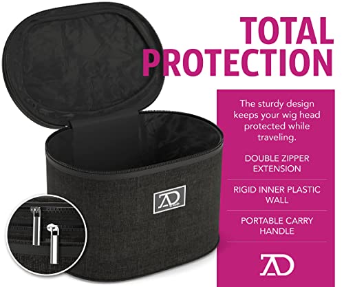 Wig Travel Case – 8″-12″ High Wig Box with Collapsible Wig Stand – Dome Foam Wig Head Stand in Zipper Carrying Case w/Handle for Safe Traveling Storage of Wigs, Lace Front Cap, Toupee (Denim Black)
