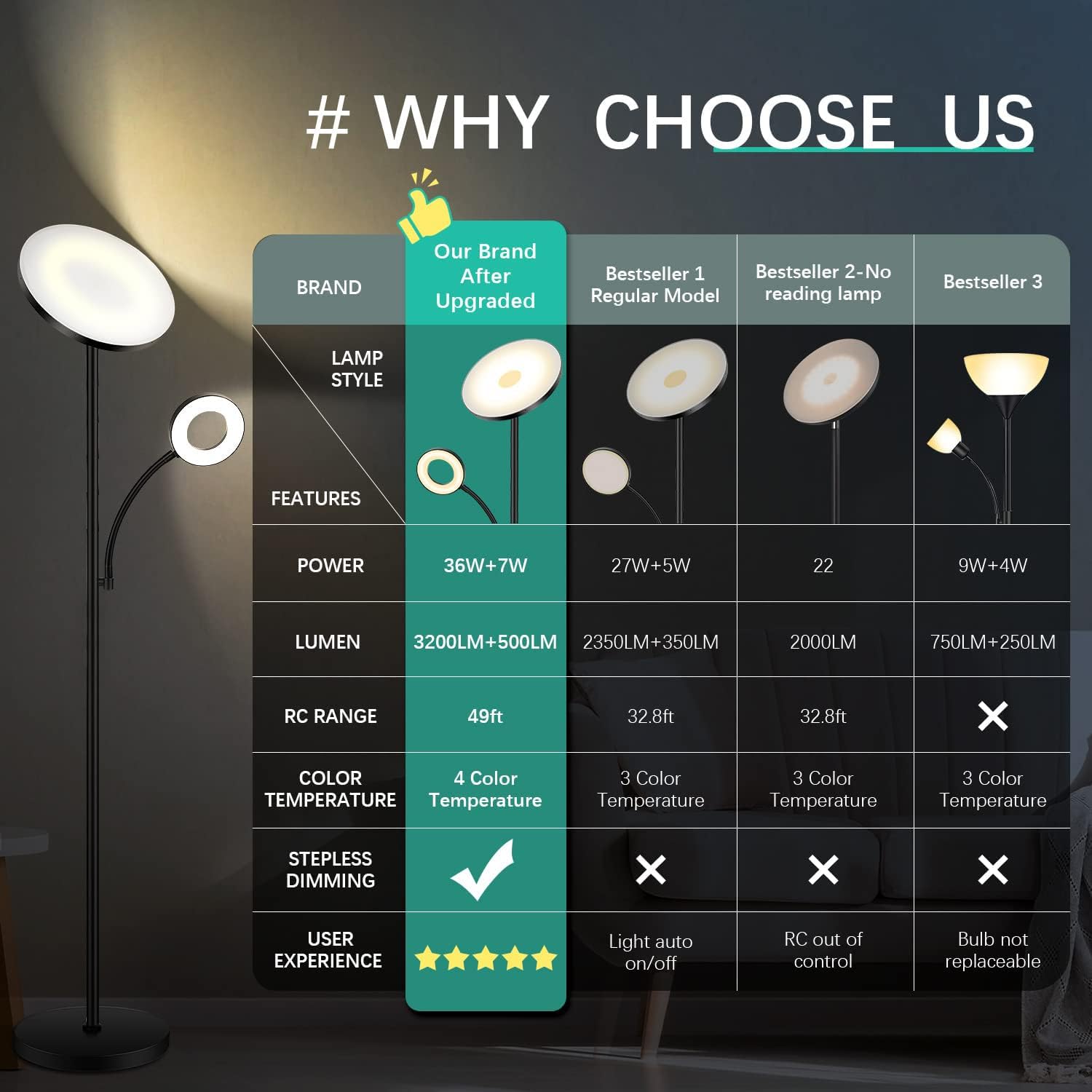 UPGRADED SUPER BRIGHT TORCHIERE FLOOR LAMP: Our strong R&D team has upgraded the brightness and performance based on the same product on the market. Compared with other standing lamps with main lamp 27W/2350lm and reading lamp 5W/400lm, 126+22 LED beads, ours is 36W/3200lm and 7W/500lm, 132+28 LED beads. It is brighter enough to light up your living room.