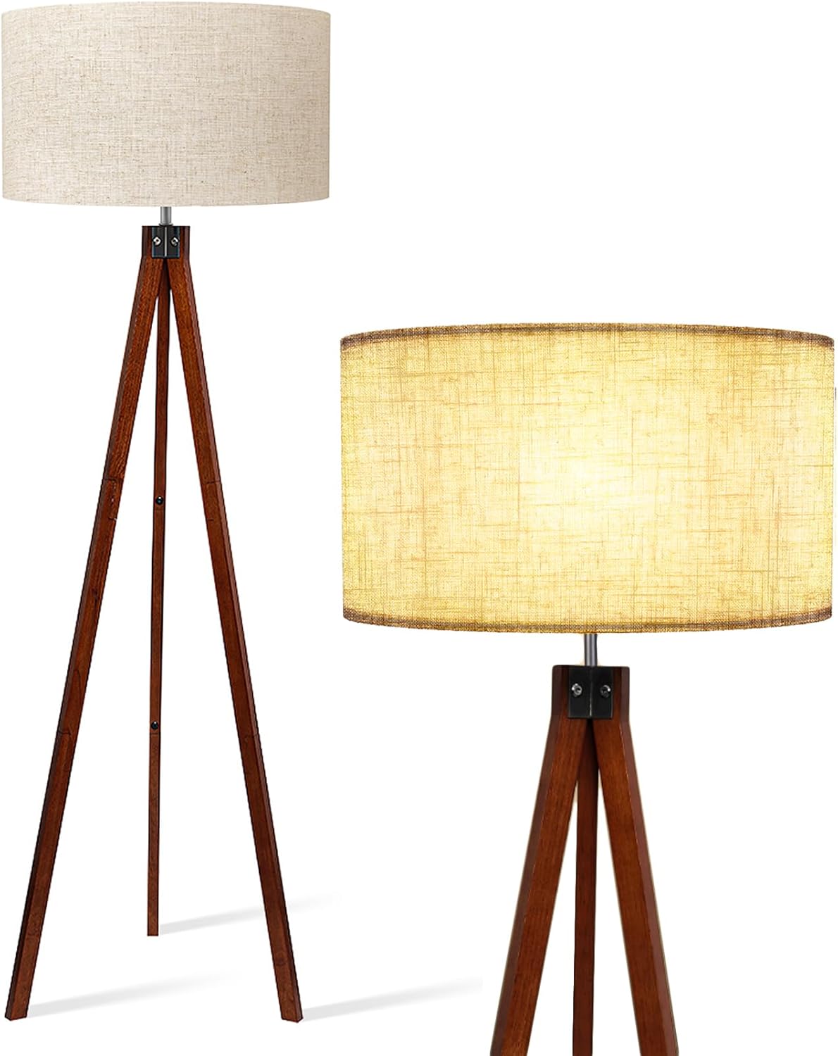 LEPOWER Wood Tripod Floor Lamp, Mid Century Standing Lamp, Modern Design Studying Light for Living Room, Bedroom, Study Room and Office, Flaxen Lamp Shade with E26 Base Brown