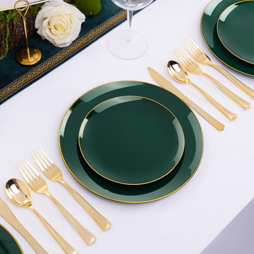 YOUBET 125PCS Green Plastic Plates – Green Disposable Plates With Gold Rim – Green Plates Disposable Include 25 Green Dinner Plates, 25 Dessert Plates, 75 Gold Cutlery for Party Wedding & Christmas