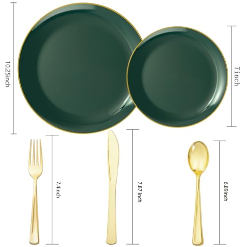 Perfect 25 Guest Sets: These green plastic plates with gold rim are perfect for 25 guests. It includes 25pcs 10.25inch dinner plates, 25pcs 7.5inch dessert plates, 25pcs plastic spoons, 25pcs plastic knives, 25pcs plastic forks. This green plates with gold trim is ideal for any occasion, they are sturdy construction resists breakage, bending, and snapping.