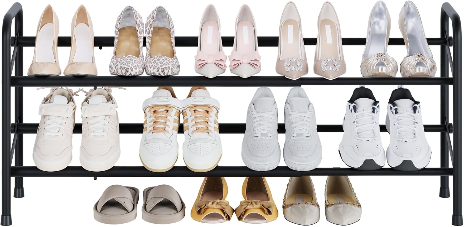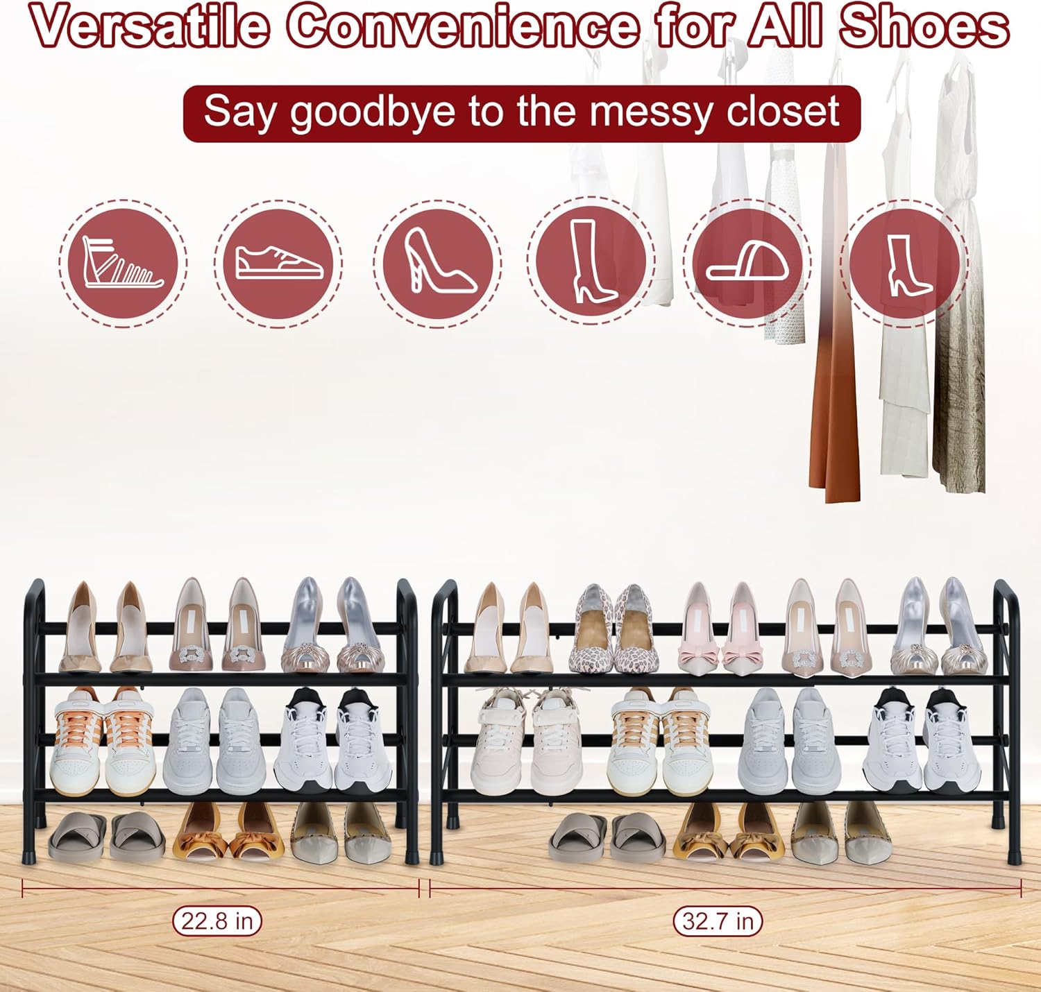 Expandable & Adjustable: Our 2 – tier shoe rack for closet can extend to fit various space sizes, stretching from 23.3” to 35.6” to accommodate your room’s dimensions and the shoe organizer hold up 6 to 15 pairs of adult shoes