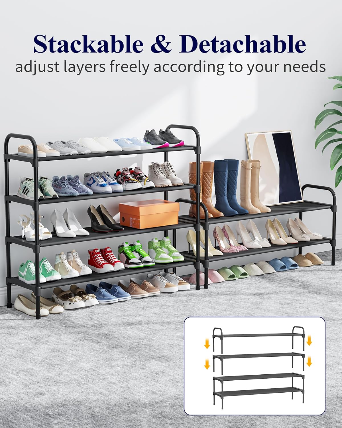 FLEXIBLE COMBINATION: This closet shoe organizer can be stacked vertically to maximize storage space without taking up additional floor space. You can also detach a tier to fit it into compact areas or remove the fabric layers to accommodate long boots. The stackable and removable design makes it easy to customize the shoe rack to suit your needs.