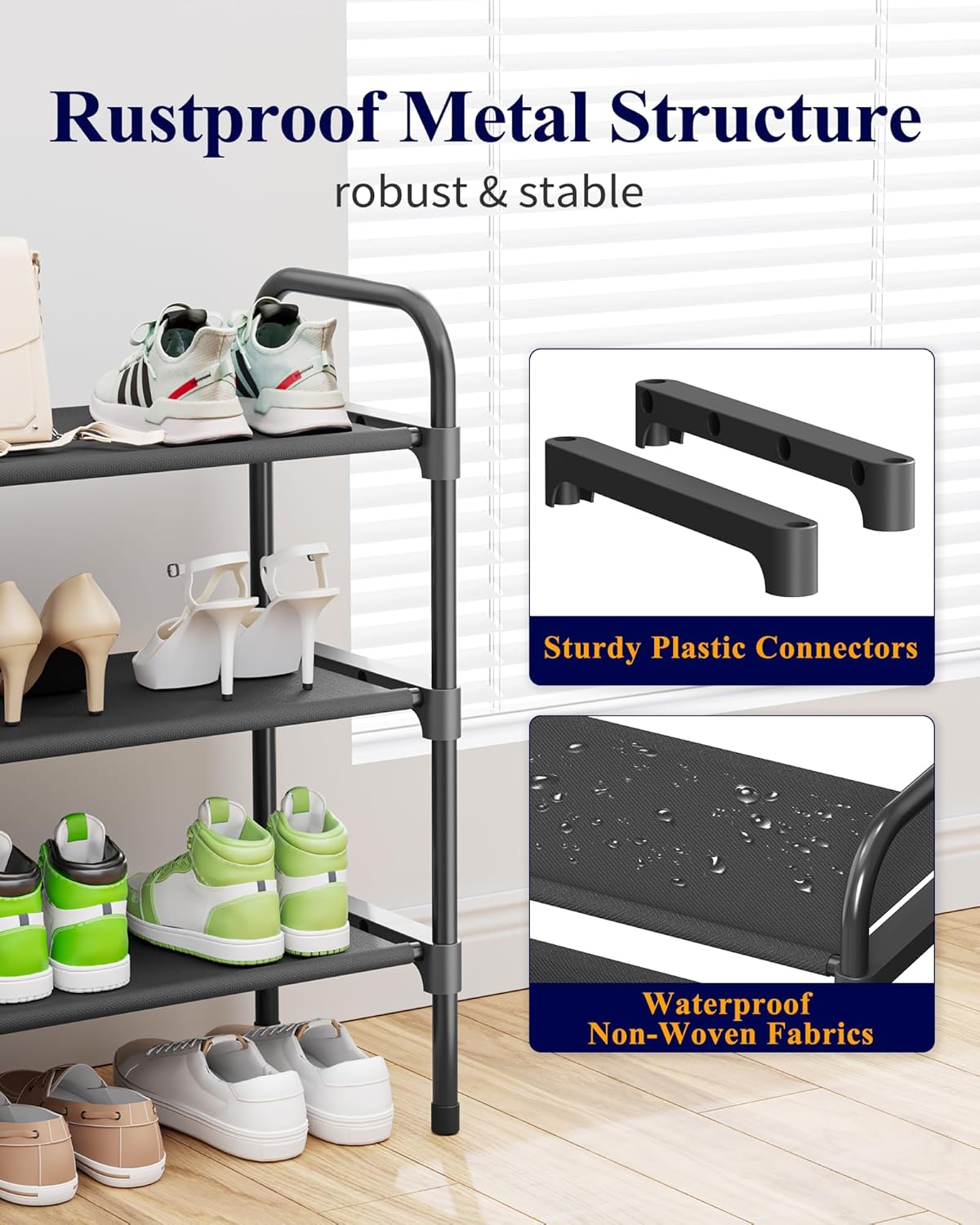 HIGH-GRADE CONSTRUCTION: Built to withstand frequent use, this shoe rack for front door entrance features a strong, stable structure that resists deformation. The sturdy U-shaped connector is crack-resistant, ensuring reliable support. Its water-repellent and rust-proof material also makes it easy to clean and maintain.
