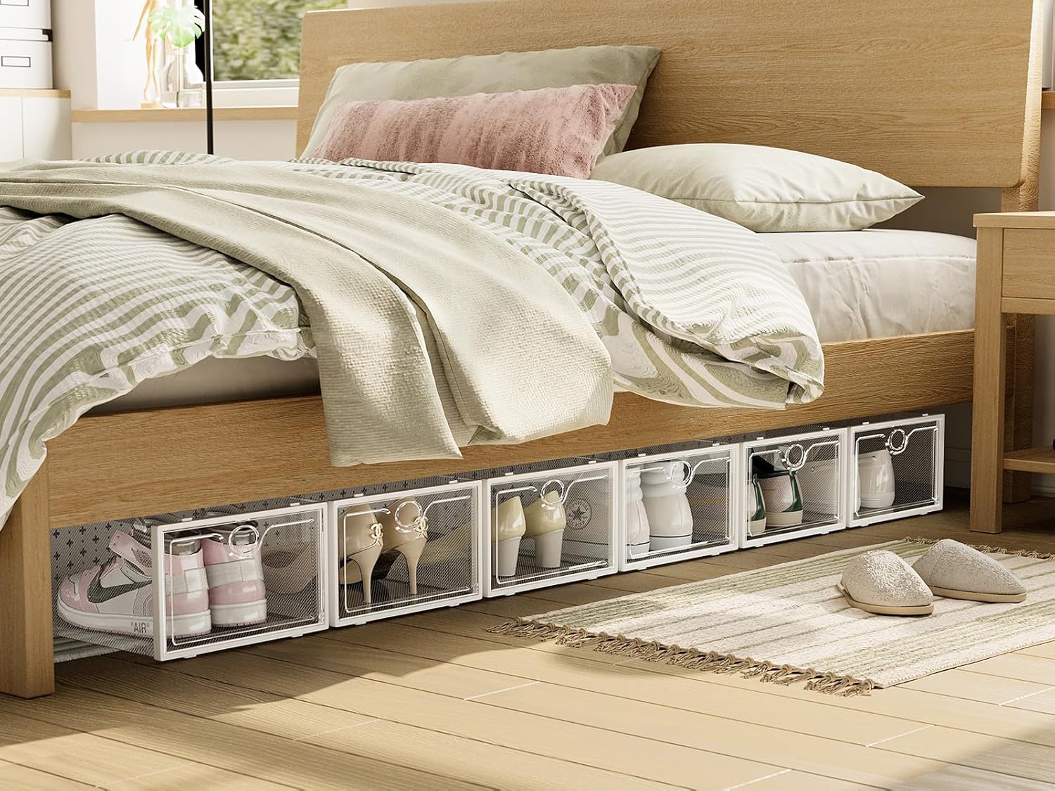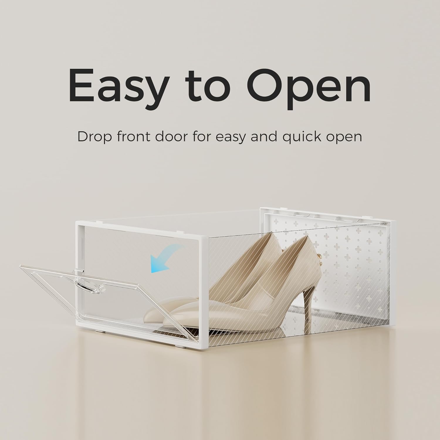 【Clear yet Breathable】Clear shoe boxes with clear front door allows you easily see the shoes you want and take them out.The back frame is porous and very breathable but still dust free.