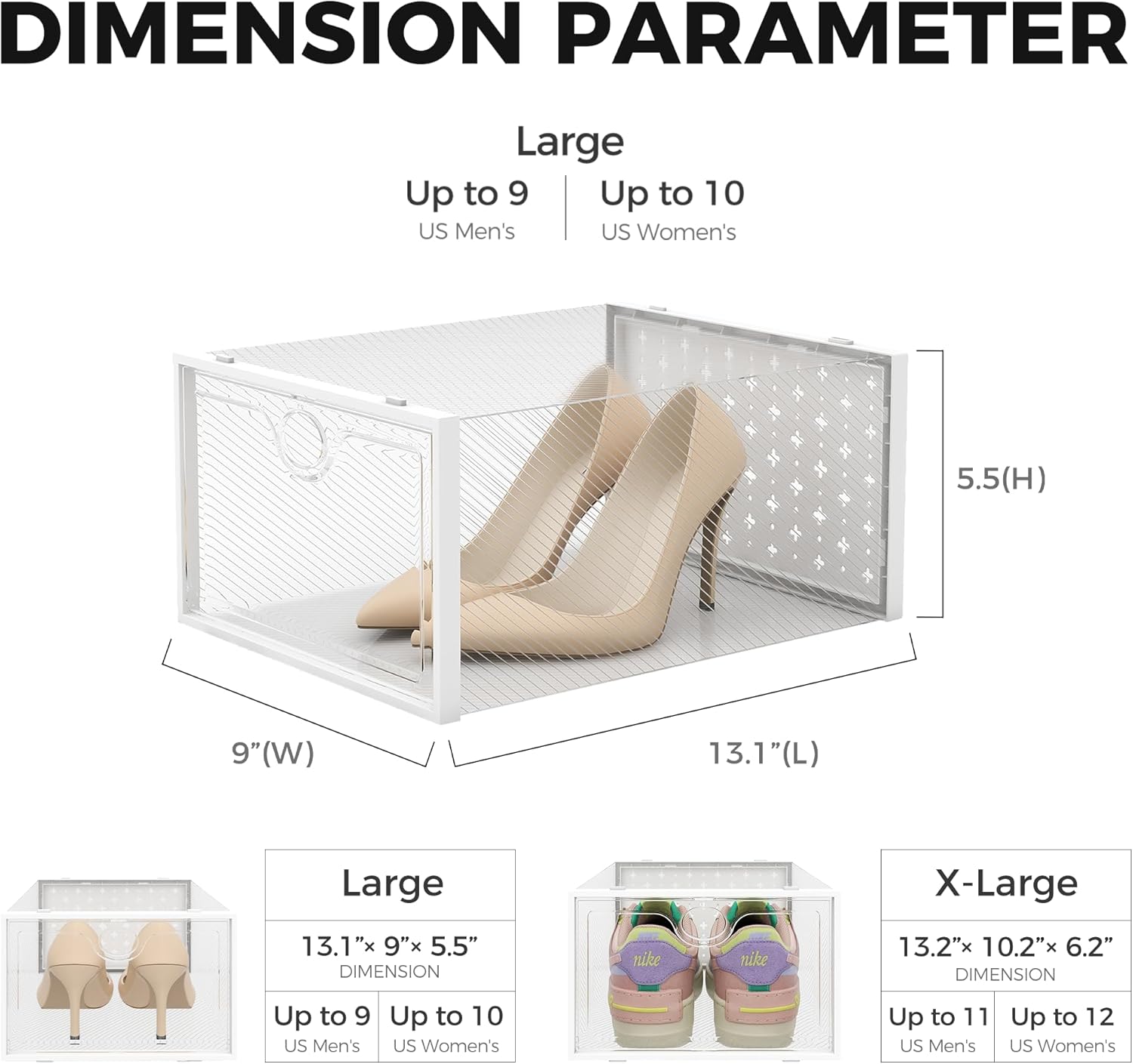 【Suitable Dimesion】If you are still worried about whether the shoe storage boxes are suitable for your shoes. Don’t worry, the shoe bins has a size of 【13.1(L) x 9(W) x 5.5(H)】inches, these medium size shoe boxes which fit for Men’s 9 size/Women’s 10 size.
