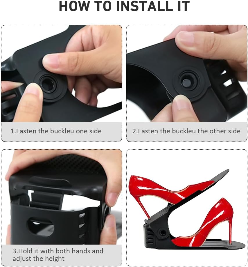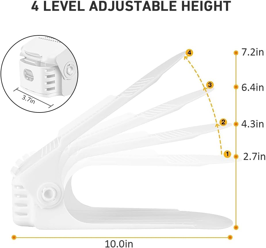 PERFECT FOR ALL TYPES OF SHOES : 4 Levels adjustable,You can adjust the height flexibly of the shoe slots organizer from 2.7’’ to 7.2’’, the shoe stacker perfect for most shoes, It fits slippers, pumps,sneakers,leather shoes,ankle boots,hiking boots,heels, and children’s shoes