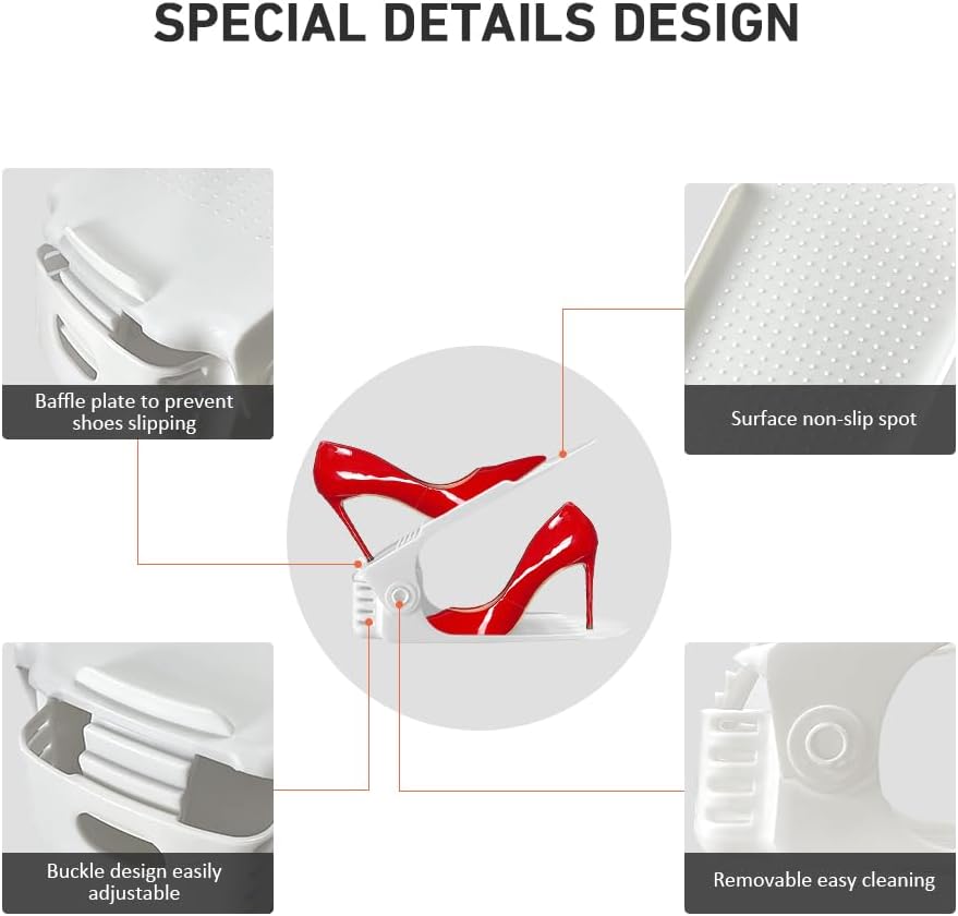 50% SHOE SPACE SAVERS : The double-layered design of the shoe slots organizer fits two pairs of shoes in the space for one pair,Greatly increased the storage space of shoe rack, each shoe is allocated its own independent space, ensuring not squeeze and destroy shoes