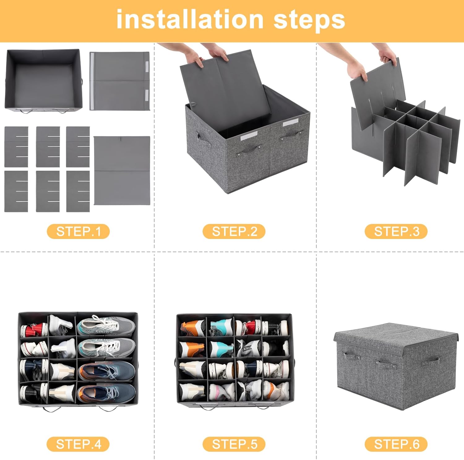 Adjustable Dividers : Storage compartment can be adjusted according to your shoe sizes4 Rivets Reinforcement Handles: It is easy to grab, You can easily carry the shoe storage containers around your homeHigh-Quality Material : Made of heavy-duty cardboard side panels and the inserted bottom plate, make shoe storage box stackableFlip-top lid : Keep your items away from dust, open the lid can also be used as an open shoes boxStackable : The shoes bins has a sturdy top, bottom and side, you can stack themCollapsible : You easily fold or unfold those shoe storage. Easy to carry and store