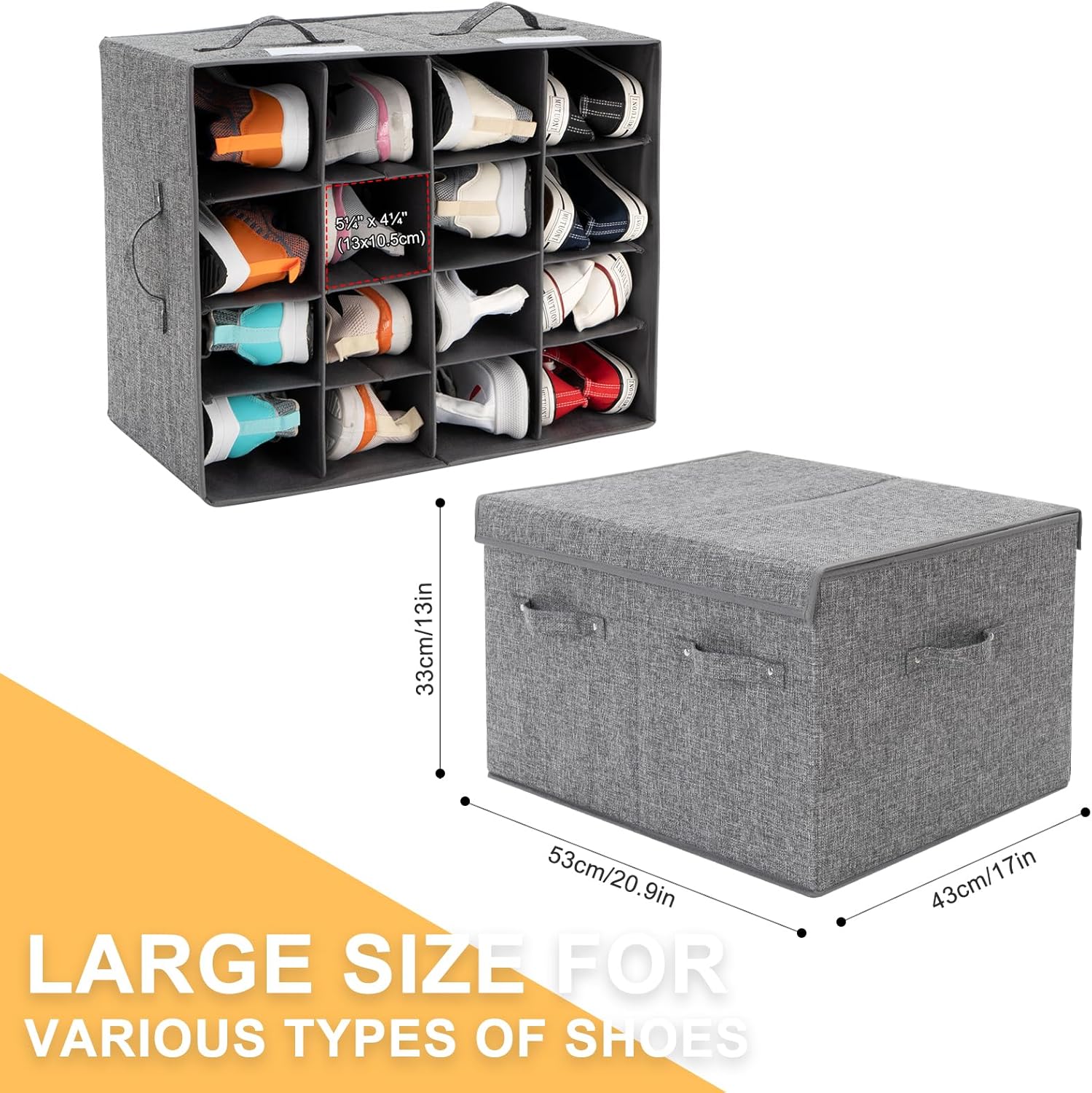 HEAVY DUTY & DUSTPROOF : Shoe organizer 16 pairs is made from premium polyester and sturdy thick cardboard, sturdy and durable, removable flip top lid keeps contents out of sight when closed and detaches velcro to be used as open top shoe box