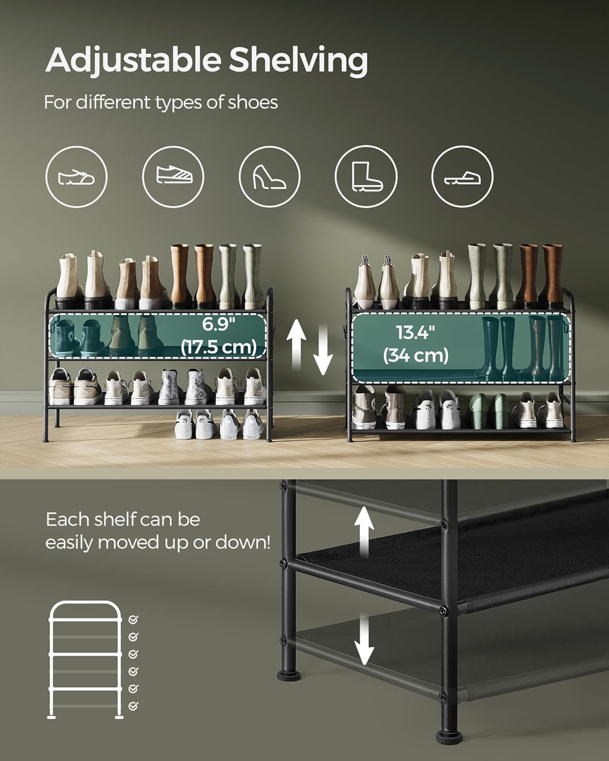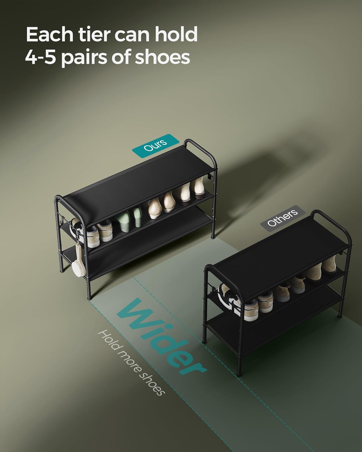 [Store Your Shoes with Ease] With each level of our shoe shelf designed to comfortably fit 4-5 pairs of shoes, you can enjoy organized, easy-to-access storage for your preferred footwear!