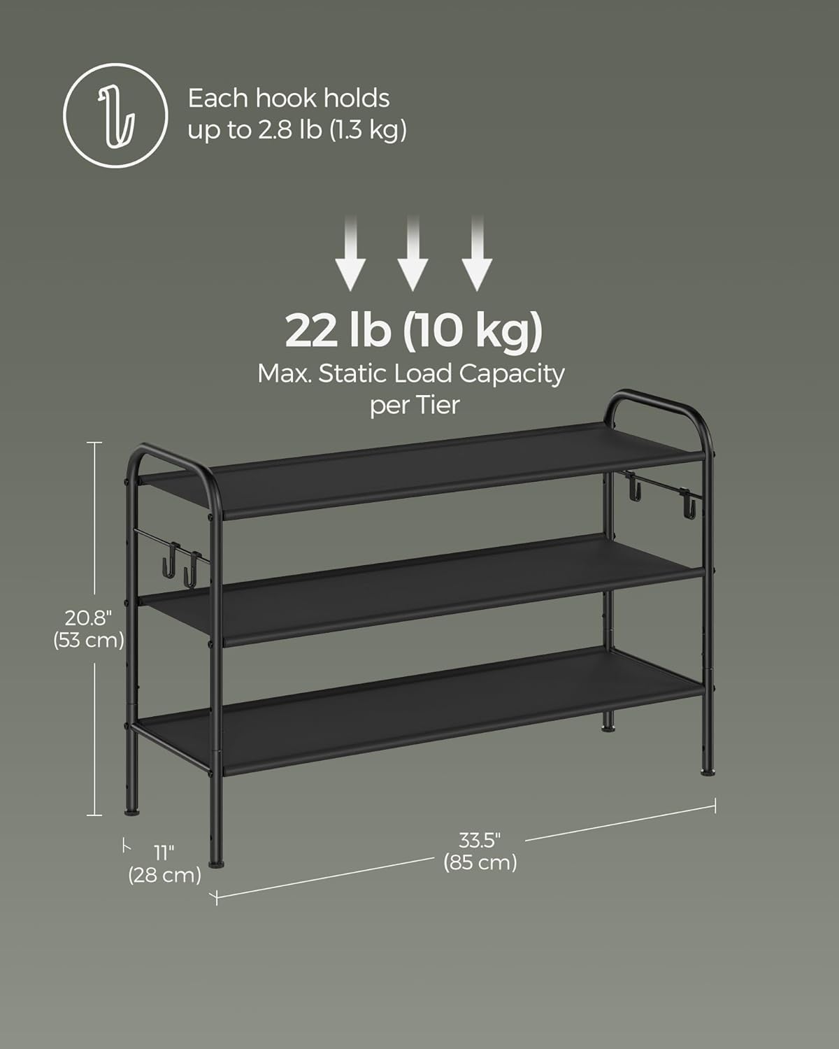 Color: Ink BlackMaterial: Polyester Fabric, SteelProduct Size: 11″D x 33.5″W x 20.8″H (28 x 85 x 53 cm)Product Weight: 3.7 lb (1.7 kg)Max. Static Load Capacity per Tier: 22 lb (10 kg)Max. Static Load Capacity per Hook: 2.8 lb (1.3 kg)Total Max. Distributed Load Capacity: 77 lb (35 kg)