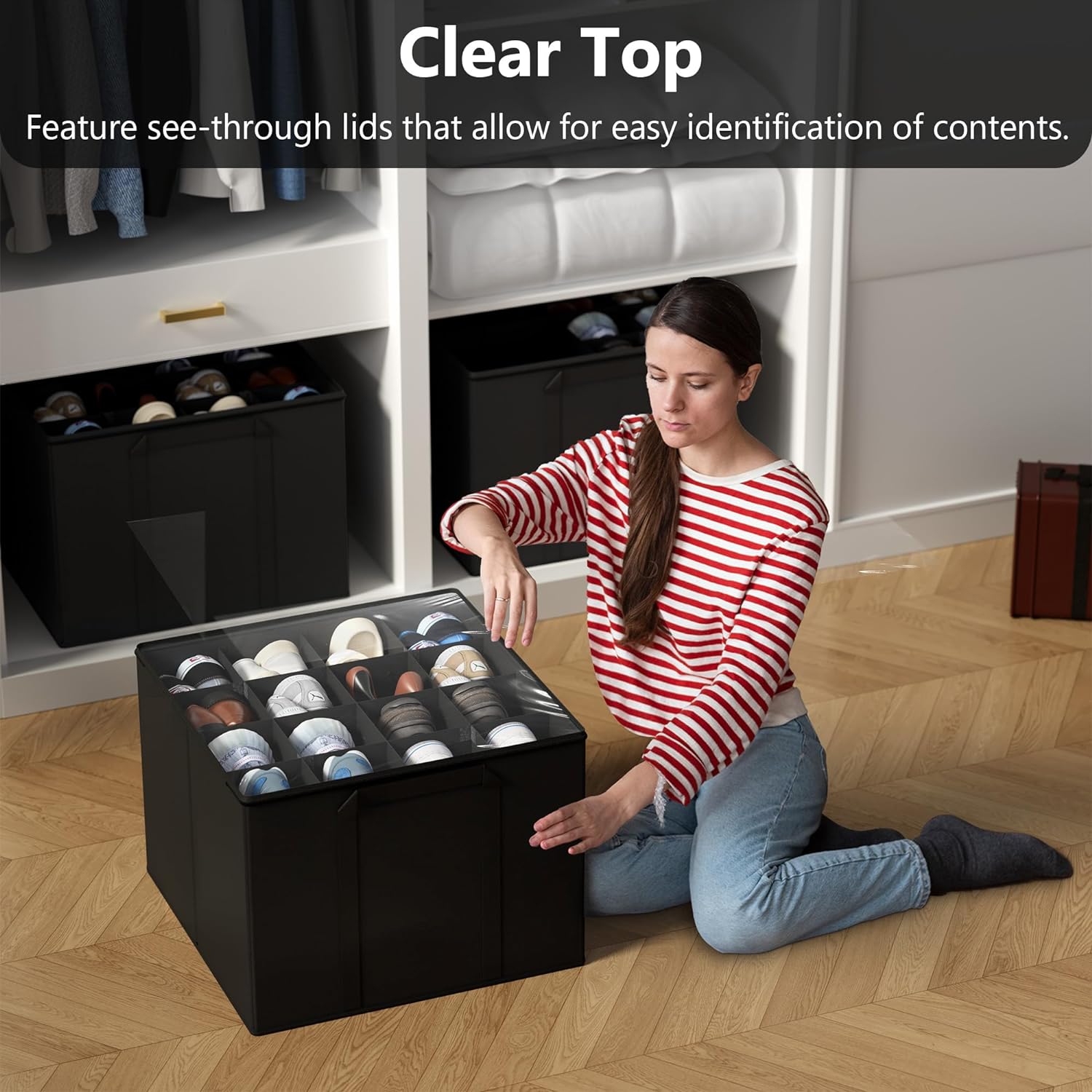 SUOCO 2 Pack Shoe Organizer for Closet, Fits up to 32 Pairs, Small Space Shoe Storage Boxes Bins Containers w/Adjustable Dividers and Clear Top, Black