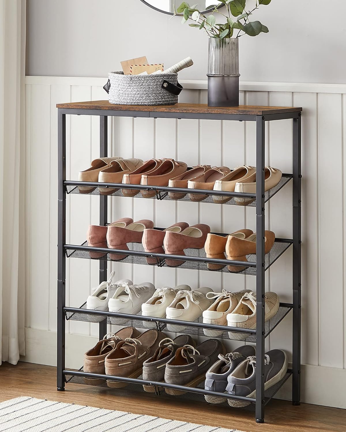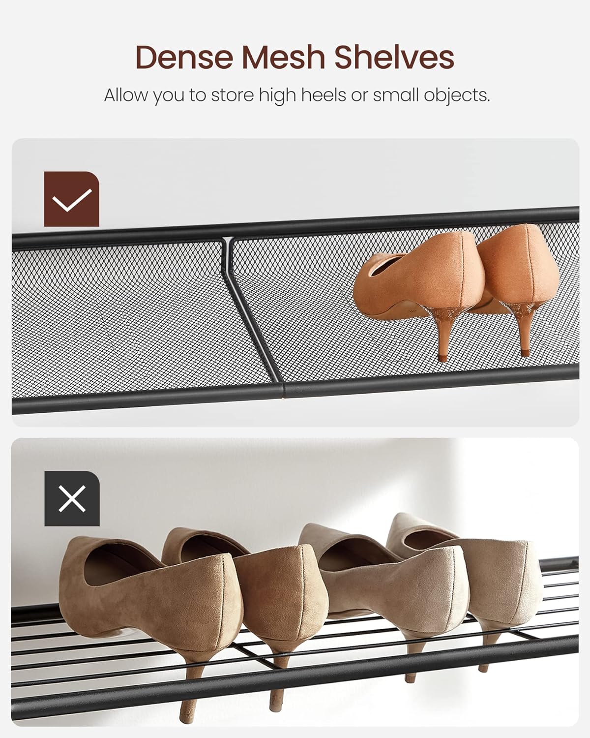 [Holds More Shoes] This 5 tier shoe rack can hold 16-20 pairs of shoes with the top board; the distance between each of the 4 mesh shelves is 8″ to fit heels and high tops on the shelves