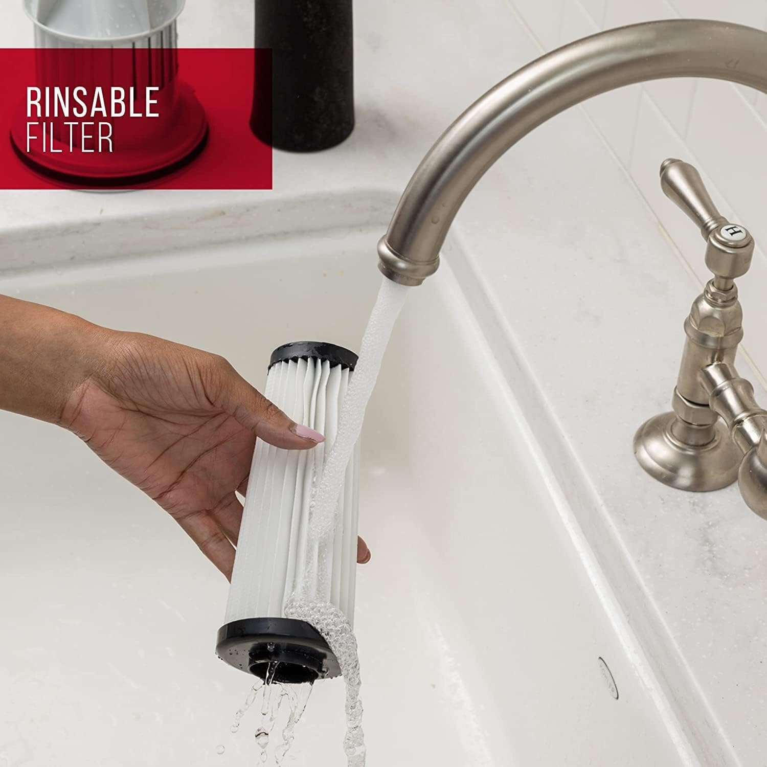 EASY-EMPTY DIRT CUP: This Dirt Devil vacuum cleaner features a one touch, easy-release dirt cup so you take fewer, quicker and easier trips to the trash. A rinsable filter provides easier-than-ever maintenance.