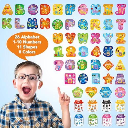 Early Learning Toddler Flash Cards Set – Package includes 26 alphabet flashcards, 10 numbers flashcards, 11 shapes flashcards, 8 colors flashcards, a total of 55 cards. Comes with an additional 8 colored dry erase markers and 240 glue point dots. Make kids learning with fun!