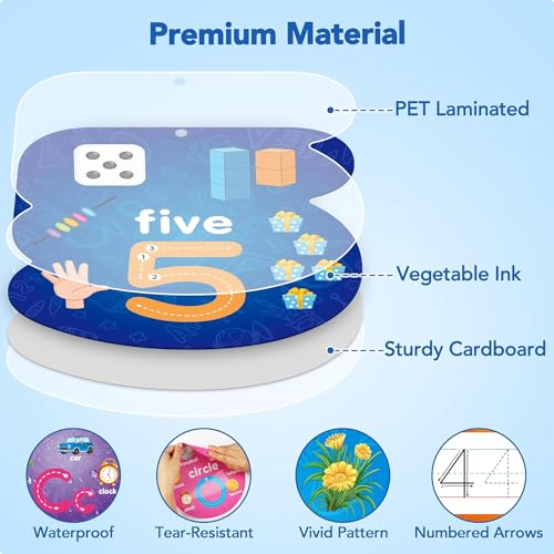 Premium Material – Made of sturdy cardboard, tear-resistant. Printed with vegetable ink, vibrant and clear. Double sides are PET laminated, waterproof, dry erase and reusable. Smooth edges, burrs-free, safe for kids’ little hands. Each cards measures about 8 x 9 inches.